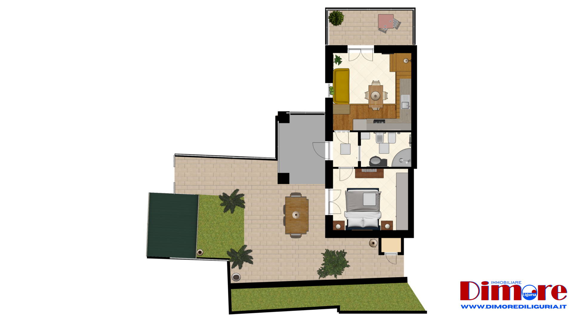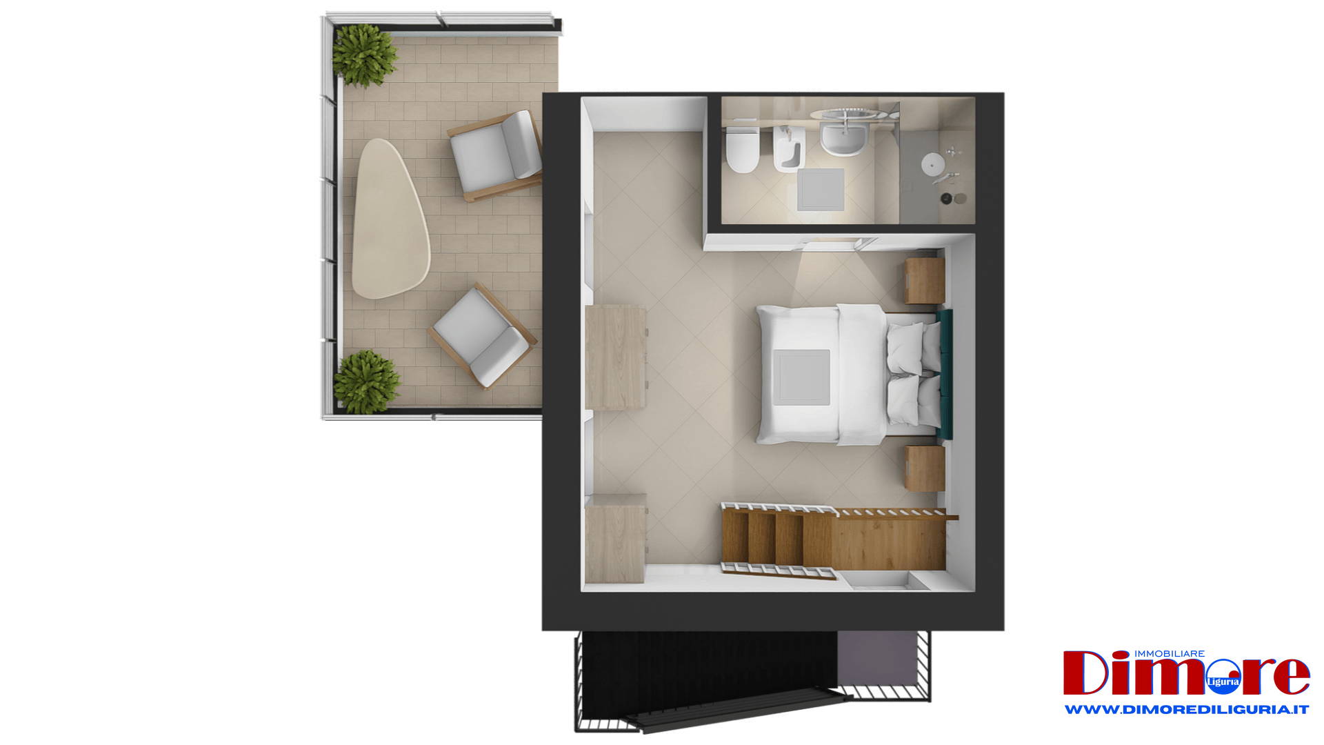 Per chi desiderasse una zona giorno più ampia, è possibile trasformare la camera al piano principale in soggiorno (facilmente trasformabile in zona notte con divano letto) per destinare l’attuale soggiorno con angolo cottura esclusivamente a zona cucina-pranzo.