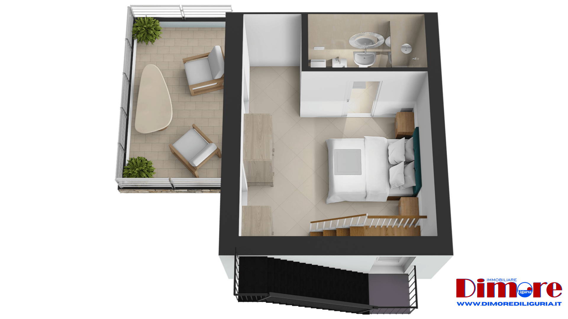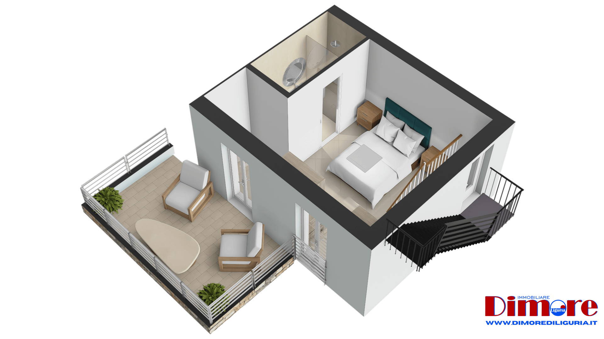 Dal soggiorno la scala in legno conduce al soppalco che ospita la seconda camera da letto con bagno privato. La camera dispone di un ampio terrazzo panoramico con vista mate. Tramite una scala esterna si raggiunge infine la terrazza solarium posta sulla sommità dell’edificio, perfetta per momenti di relax in totale privacy.