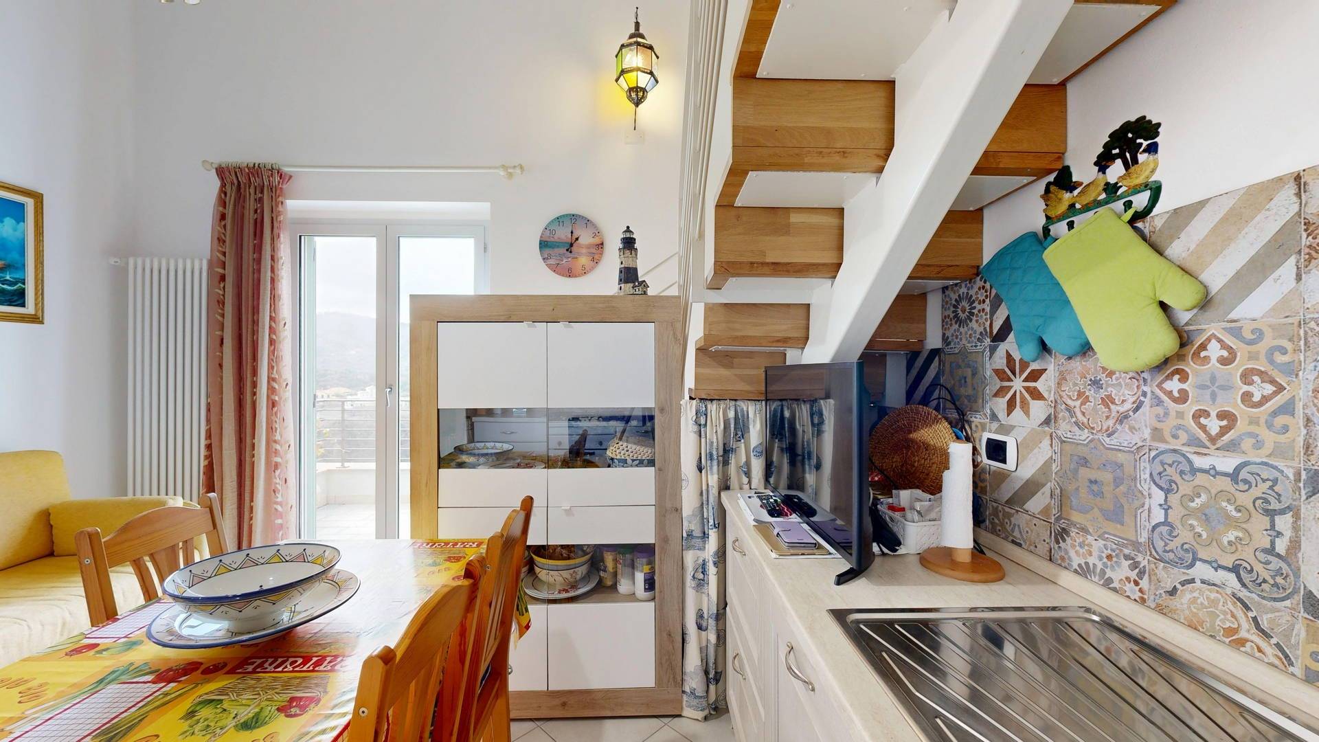L’ingresso si apre su un disimpegno che conduce alla zona giorno con soggiorno e cucina a vista, affacciata su un ampio balcone con vista panoramica sulla collina antistante e vista mare sullo sfondo.
