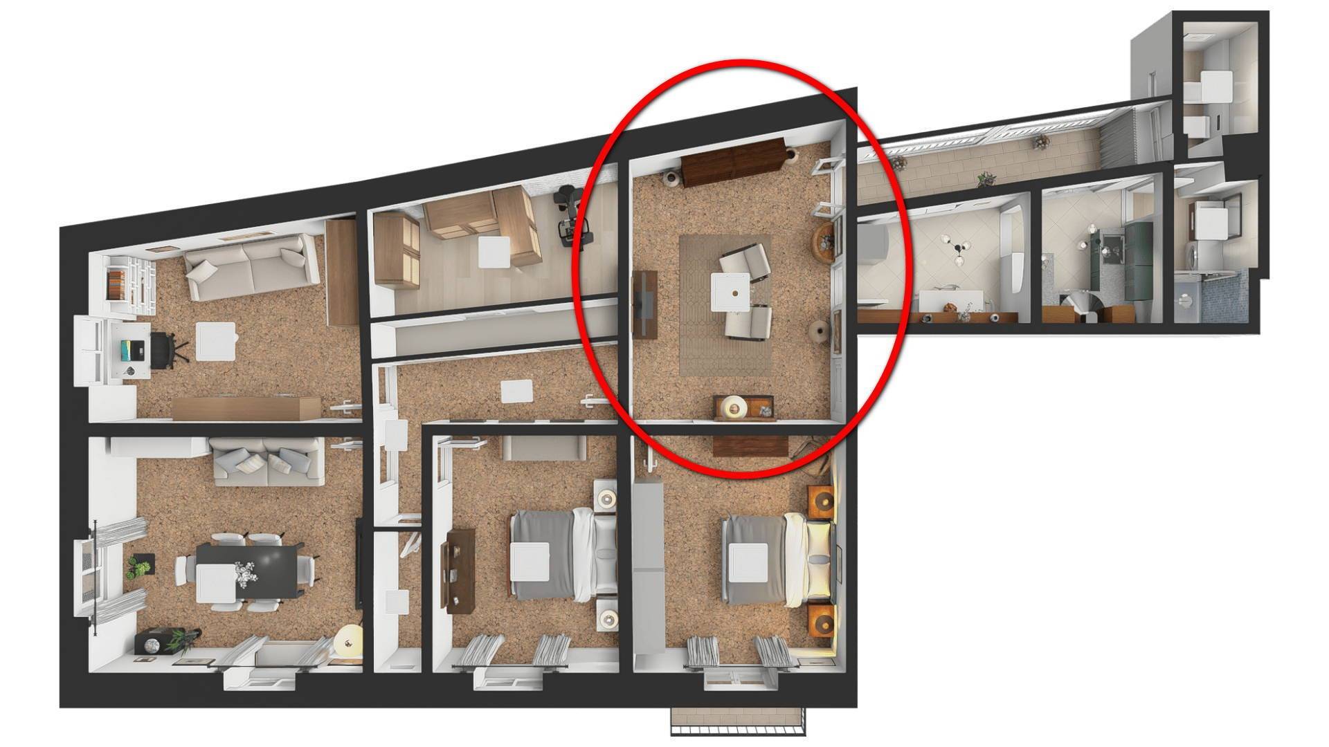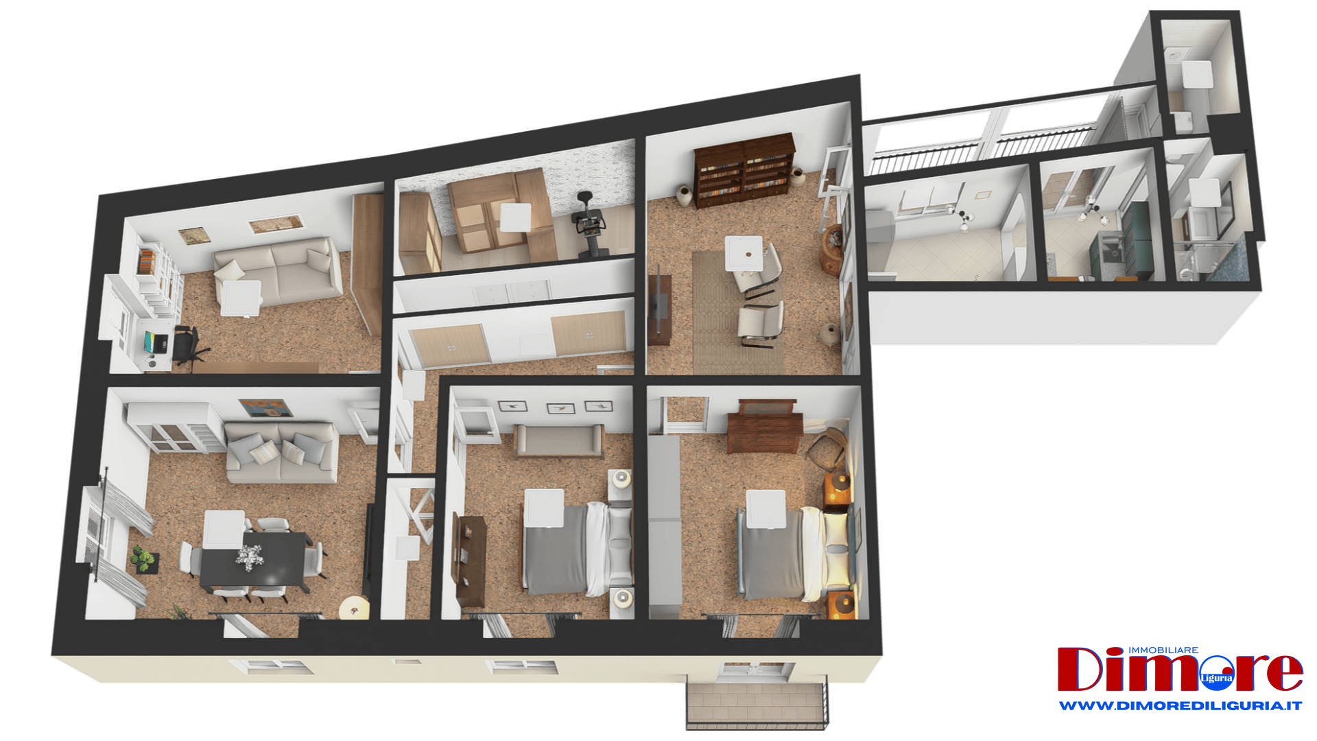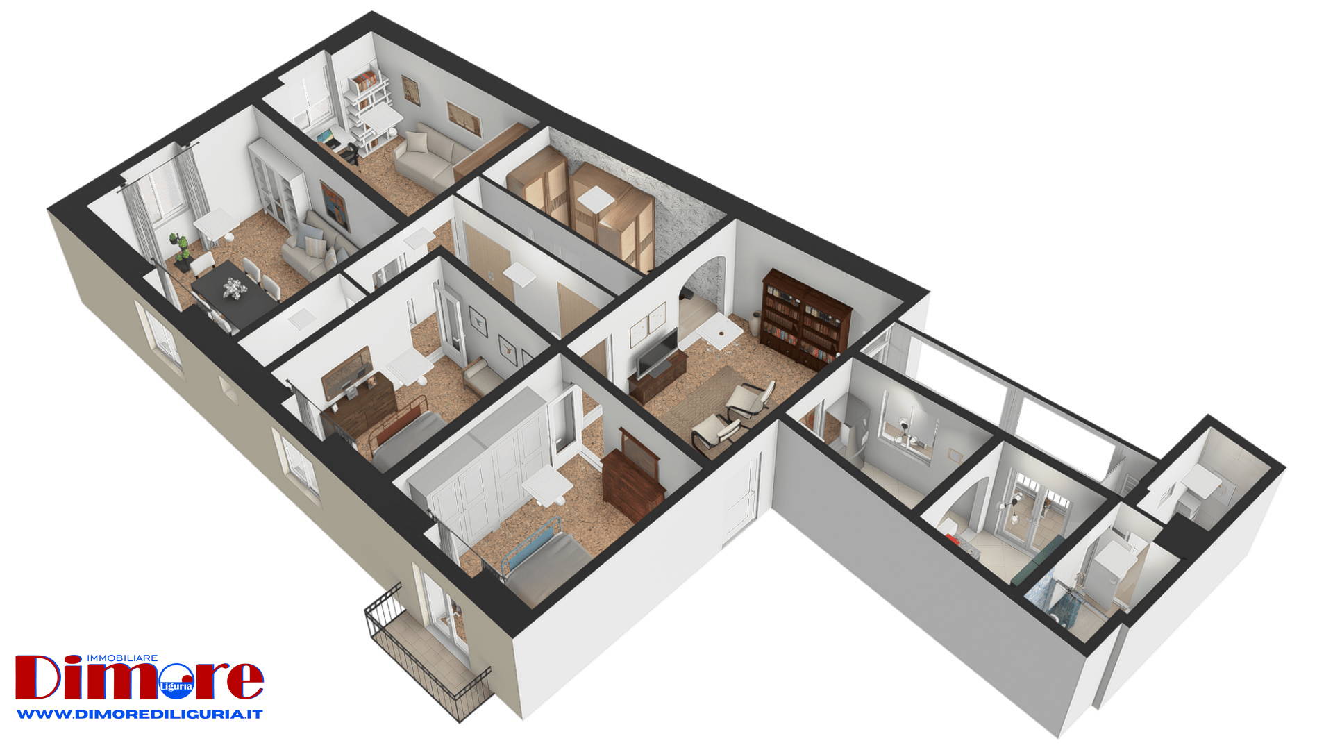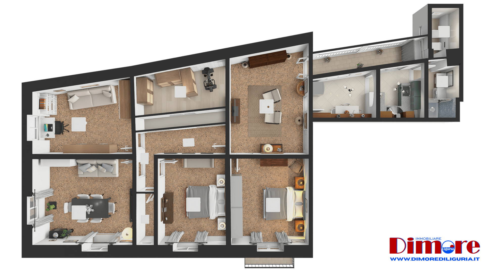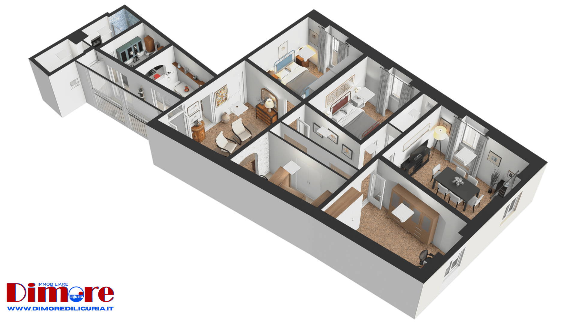 La zona notte comprende tre camere da letto, tutte di generose dimensioni. Una di esse, posta accanto al vano di ingresso, dispone di porta finestra con un balconcino affacciato su Via Guidobono con vista verso piazza del Popolo e verso le spiagge. In posizione angolare si trova inoltre un’ampia sala particolarmente luminosa ed adibita a soggiorno e zona pranzo con affacci su Corso Mazzini e Via Guidobono.